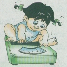 4. ถ้าเป็นเครื่องชั่งแบบยืน เวลาอ่านน้ำหนักผู้ที่ทำการชั่งน้ำหนักจะต้องอยู่ในตำแหน่งตรงกันข้ามกับเด็ก ไม่ควรอยู่ด้านข้าง เพราะจะทำให้อ่านผิดพลาดได้ อ่านค่าให้ละเอียดถึง 0.1 กิโลกรัม เช่น 9.3 กิโลกรัม